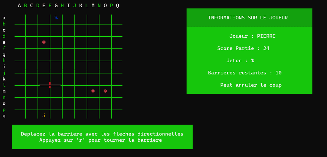 Ce projet consistait à créer une version en ligne de commande du jeu Quoridor en utilisant le langage C. Le jeu se déroulera dans le terminal, et nous utiliserons les fonctions de terminal pour créer une interface utilisateur graphique. Le jeu permettra à deux joueurs de s'affronter en utilisant des "murs" pour bloquer le passage de l'adversaire, mais il sera également possible de jouer seul contre un algorithme. Nous avons implémenté une logique de jeu solide pour gérer les règles et les conditions de victoire, et nous avons également inclus des fonctionnalités telles que la sauvegarde et la reprise de partie.